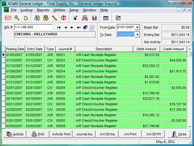 ADaM consists of 10 core modules: Accounts Payable, Accounts Receivable, Customer Processing (CRM; ‘ship to’ accounts; tax coding and control), Contact Management, General Ledger, Inventory Management (BoM; demand forecast; EOQ), Sales Order Processing (quotations; PoS; credit management), Purchasing and Receiving (purchase order expediting; shipment tracking), Vendor Processing (1099 coding; A/P invoicing) Sales Analysis and ADaM Report Builder (output to formats including RTF, PDF, XLS and HTML).